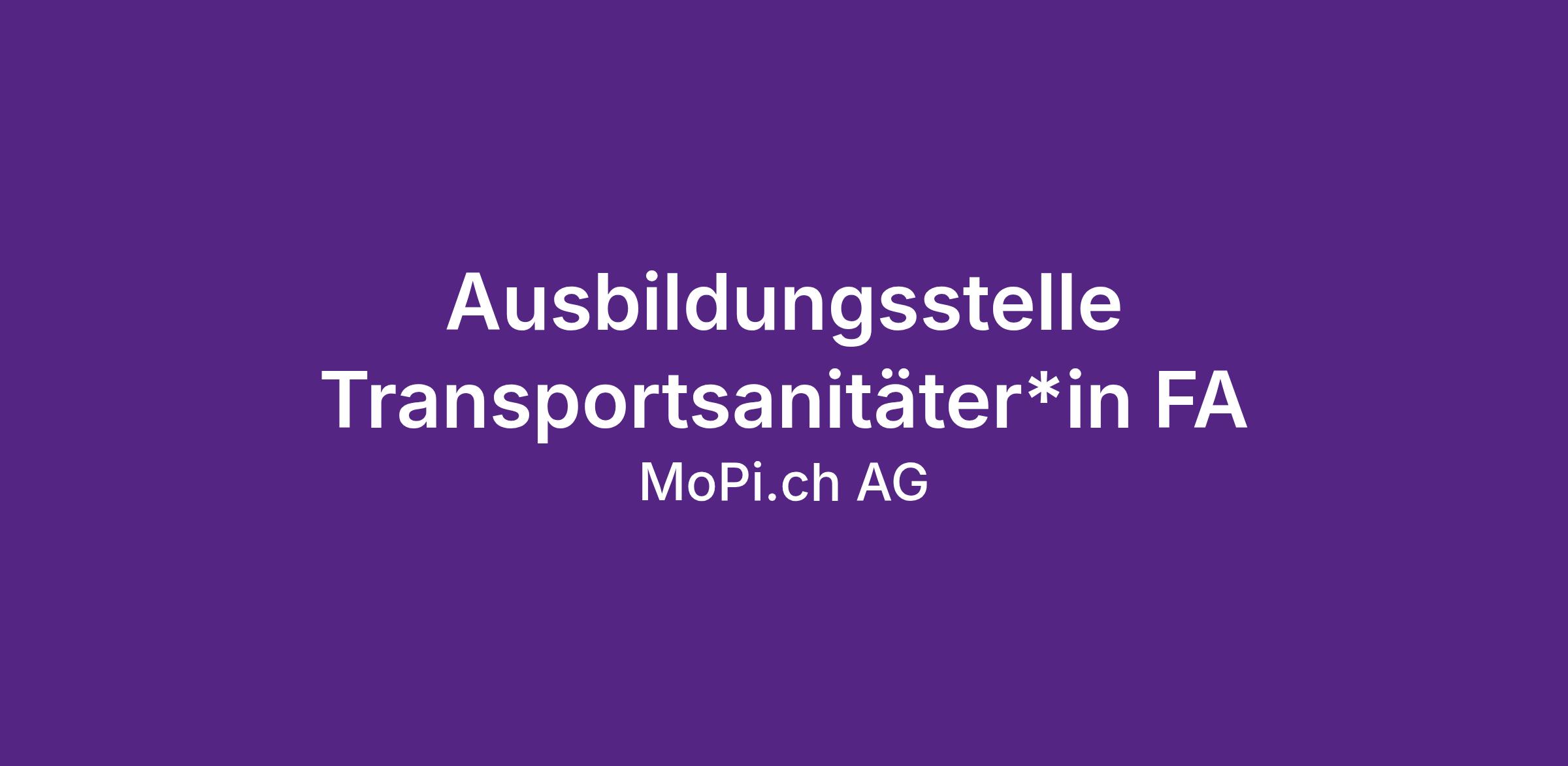 Willst du dich weiterentwickeln und im medizinisch betreuten Patiententransport durchstarten? Bist du eine Pflegefachperson (EBA, EFZ, HF/FH) oder bist motiviert, als Quereinsteiger deinen Einstieg in den medizinisch betreuten Patiententransport zu machen? Mit der MoPi.ch AG - der Schweizer Pionierin im Patiententransport – erhältst du die optimalen Einstiegs- und Weiterbildungschancen. Wir bilden dich «on the job» mit unserem internen und professionellen Ausbildungsprogramm zum/zur Transportsanitäter*in FA aus.