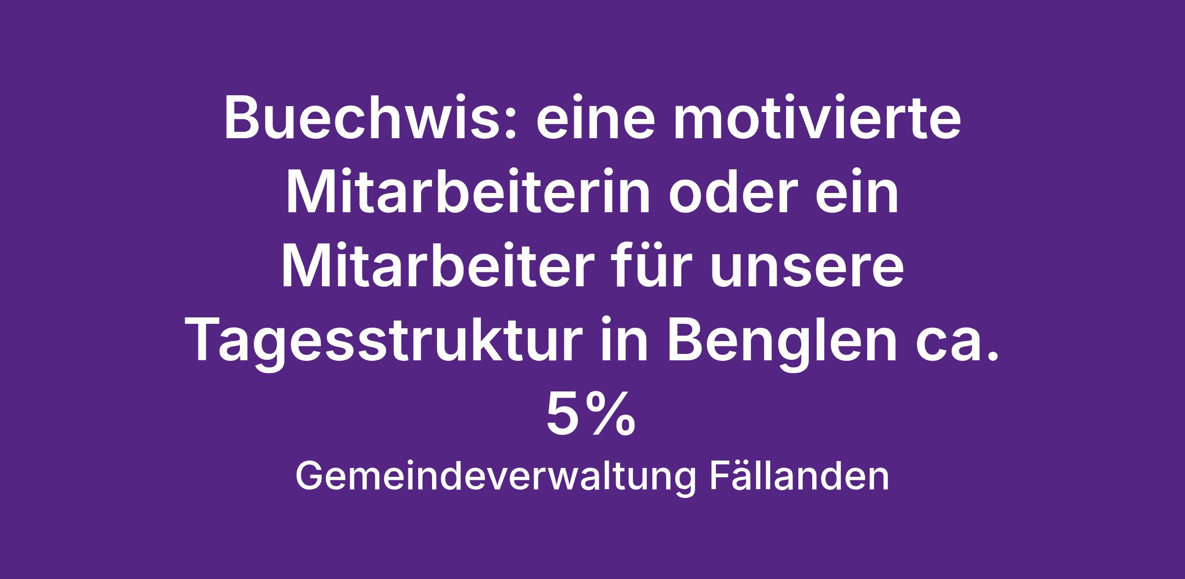 Für die Tagesstruktur Buechwis in Benglen suchen wir eine freundliche, zuverlässige und liebevolle Persönlichkeit, die Freude am Umgang mit Schülerinnen und Schülern hat und unser Team befristet vom 1. Mai bis und mit am 10. Juli 2026 unterstützt.