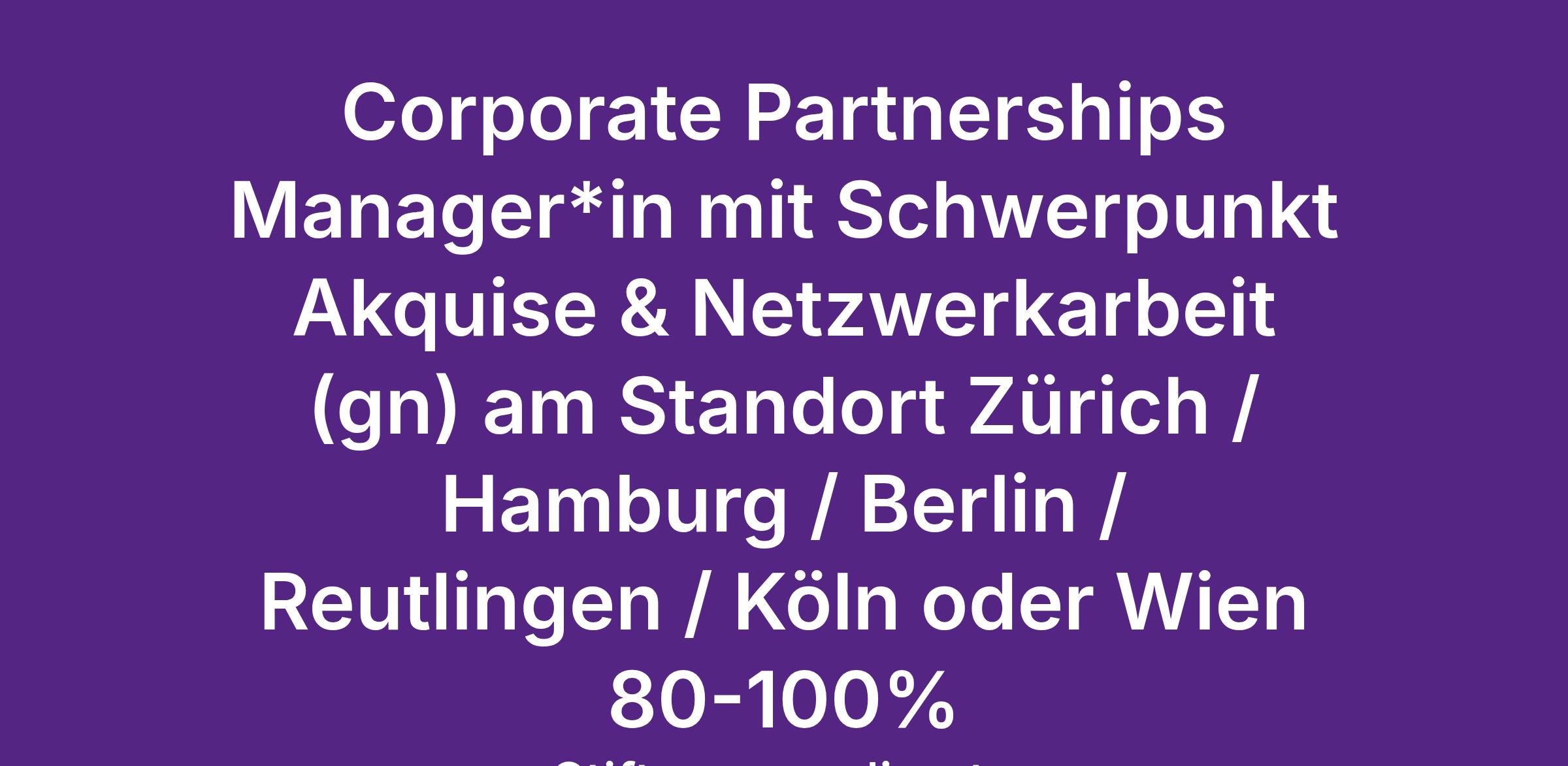 Corporate Partnerships Manager*in mit Schwerpunkt Akquise & Netzwerkarbeit (gn) 80-100% am Standort Zürich / Hamburg / Berlin / Reutlingen / Köln oder Wien