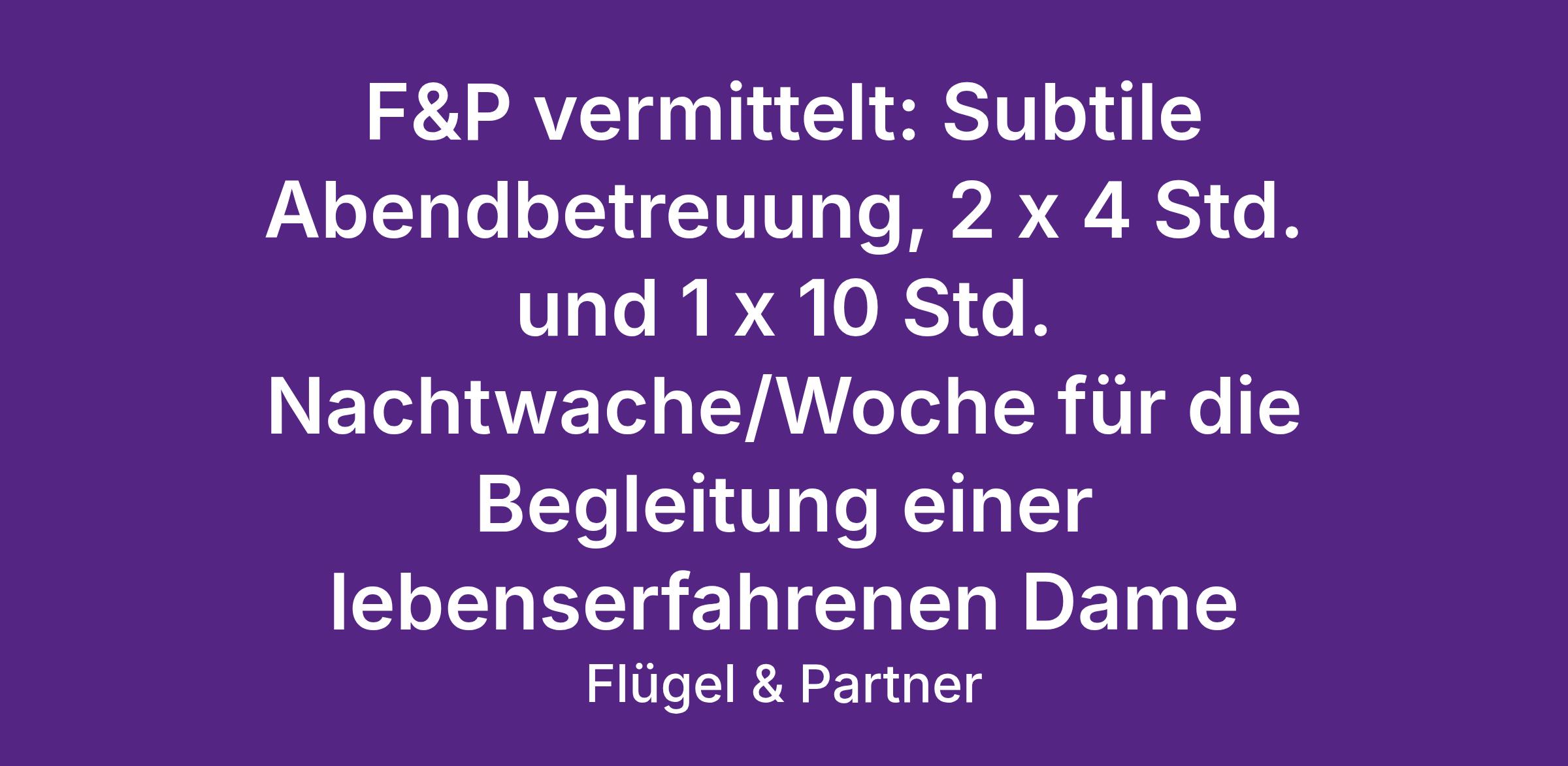 Die fröhliche Dame wünscht sich eine einfühlsame Betreuung, das Zubereiten eines einfachen, frischen Abendessens und Unterstützung beim Zubettgehen. Falls sie während der Nacht phasenweise wach ist, braucht sie Orientierungsunterstützung und Sicherheit.