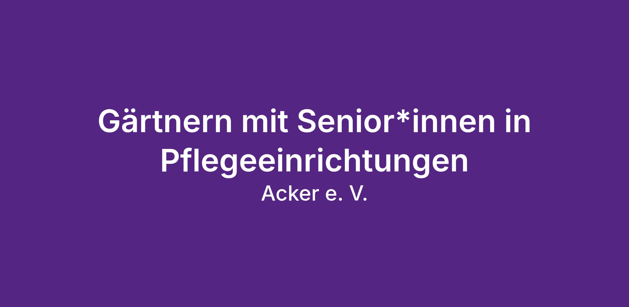 Für die Durchführung unseres integrativen gärtnerischen Angebots an Pflegeeinrichtungen suchen wir ab sofort gärtnerische Begleitung in Deutschland. Du führst sowohl mit Mitarbeitenden als auch Bewohner*innen gemeinsame Aktivierungen rund um das Thema Gärtnern durch und förderst so spielerisch die psychosoziale Gesundheit, kognitive Ressourcen, die Motivation zu Bewegung und gesündere Ernährung. Mit diesem integrativen Präventionsangebot bietet die Ackerpause Pflegepersonal und pflegebedürftigen Menschen mehr Abwechslung und Lebensqualität im Pflegealltag. Die Ackerpause hat ihre Wurzeln in dem stark wachsenden Sozialunternehmen Acker und verfolgt dasselbe Ziel: Das Bewusstsein in der Gesellschaft bezüglich Landwirtschaft, Nachhaltigkeit sowie gesunder und wertschätzender Ernährung zu stärken.
