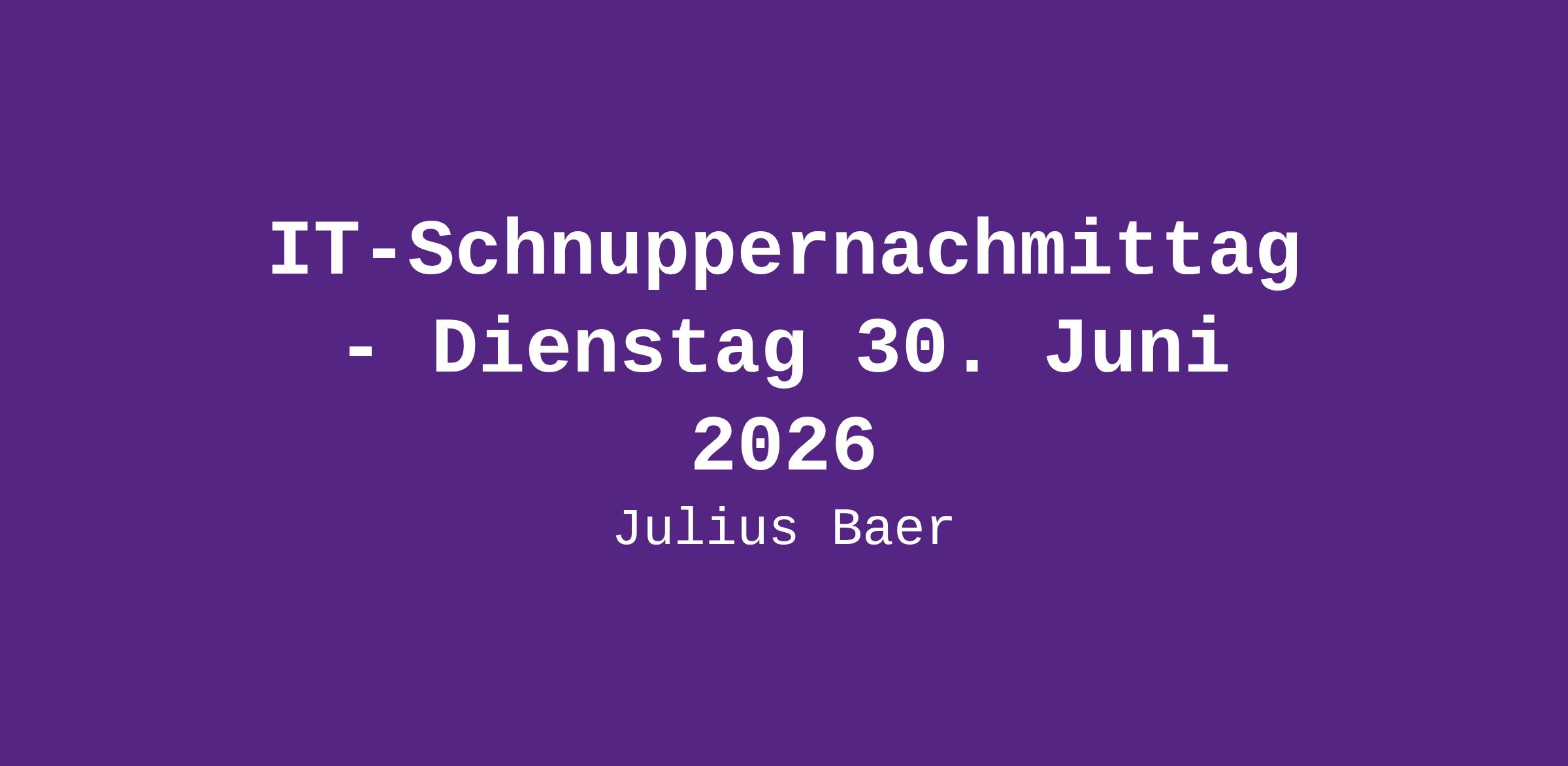 Es ist nicht einfach, sich für einen künftigen Beruf zu entscheiden. Deshalb erfährst du an unseren IT-Schnuppernachmittagen viel über die Informatiklehre (Applikationsentwicklung, Plattformentwicklung, ICT-Fachmann/Fachfrau) und den spannenden Lehrablauf bei Julius Bär. Unsere Lernenden und Coaches berichten von ihrem Alltag, ihren Highlights und stehen dir für deine Fragen rund um die Lehre zur Verfügung. Während diesem halben Tag bekommst du einen umfassenden Einblick in die IT-Welt einer internationalen Privatbank.