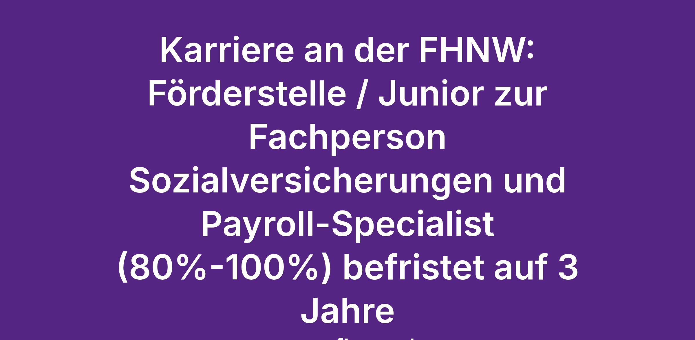 Die Fachhochschule Nordwestschweiz FHNW sucht eine engagierte und dynamische Person, die unser Team im Bereich Personal und Lohn verstärkt. Wir bieten eine unterstützende Umgebung in der Zusammenarbeit und die fokussierte Weiterbildung zur Fachperson Sozialversicherungen und Payroll-Specialist.