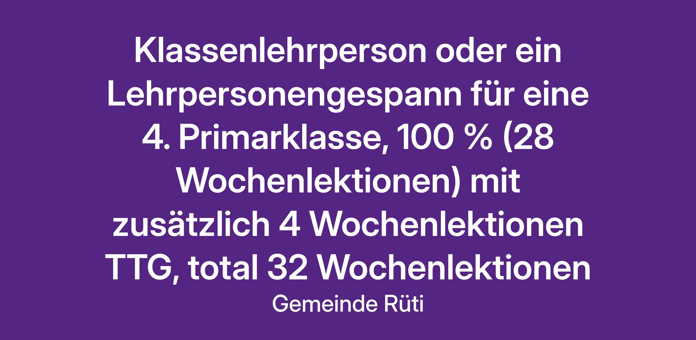 Klassenlehrperson oder ein Lehrpersonengespann für eine 4. Primarklasse, 100 % (28 Wochenlektionen) mit zusätzlich 4 Wochenlektionen TTG, total 32 Wochenlektionen