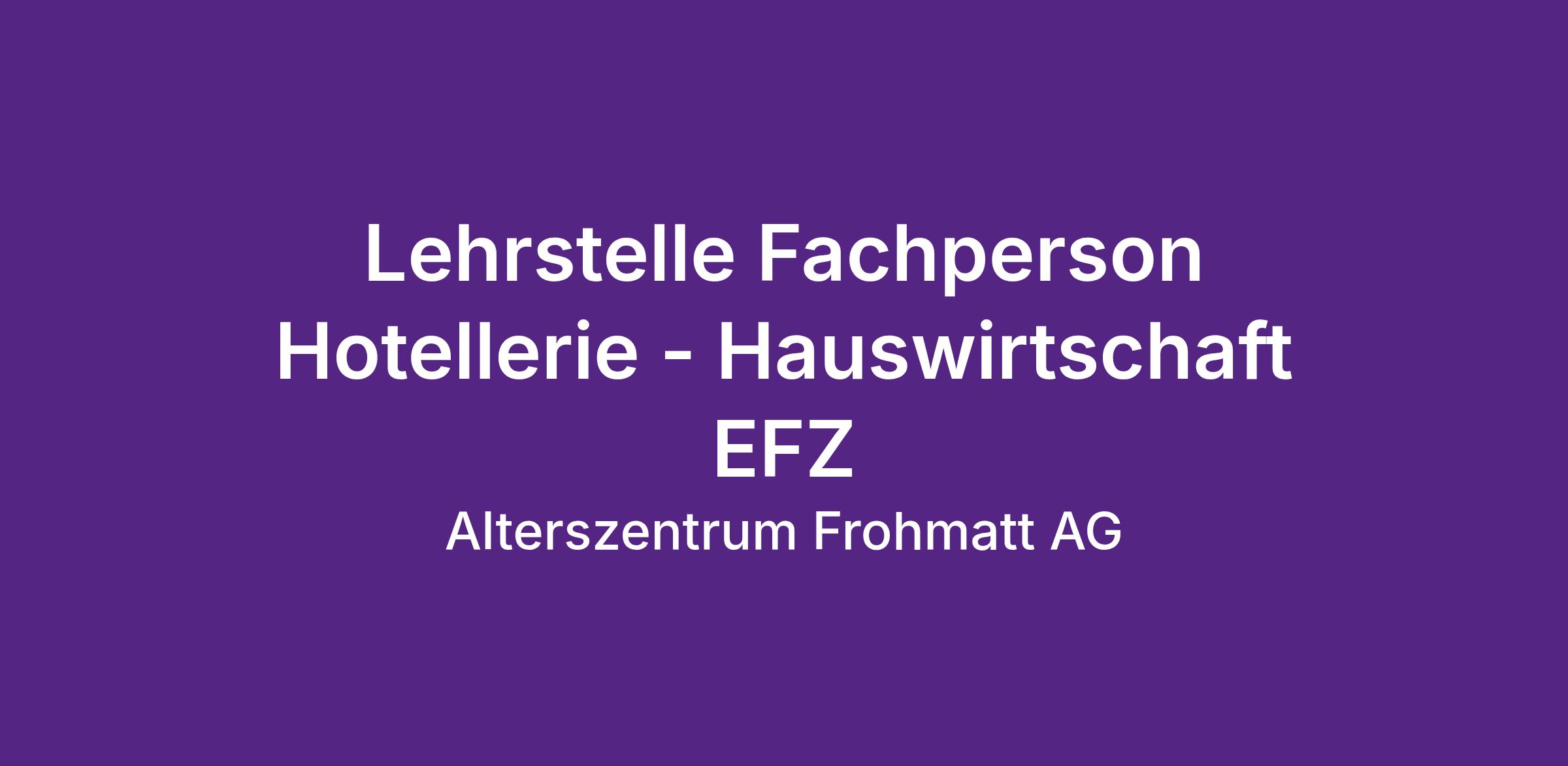 Das Alterszentrum Frohmatt bietet den Bewohnerinnen und Bewohnern eine hohe Lebensqualität. Mit einem auf die individuellen Bedürfnisse ausgerichteten Grad an Pflege und Betreuung ist die Frohmatt ein Ort, an dem man sich sofort daheim fühlt. Wir sind der Ausbildungsbetrieb für eine Fachperson Hotellerie – Hauswirtschaft EFZ.
