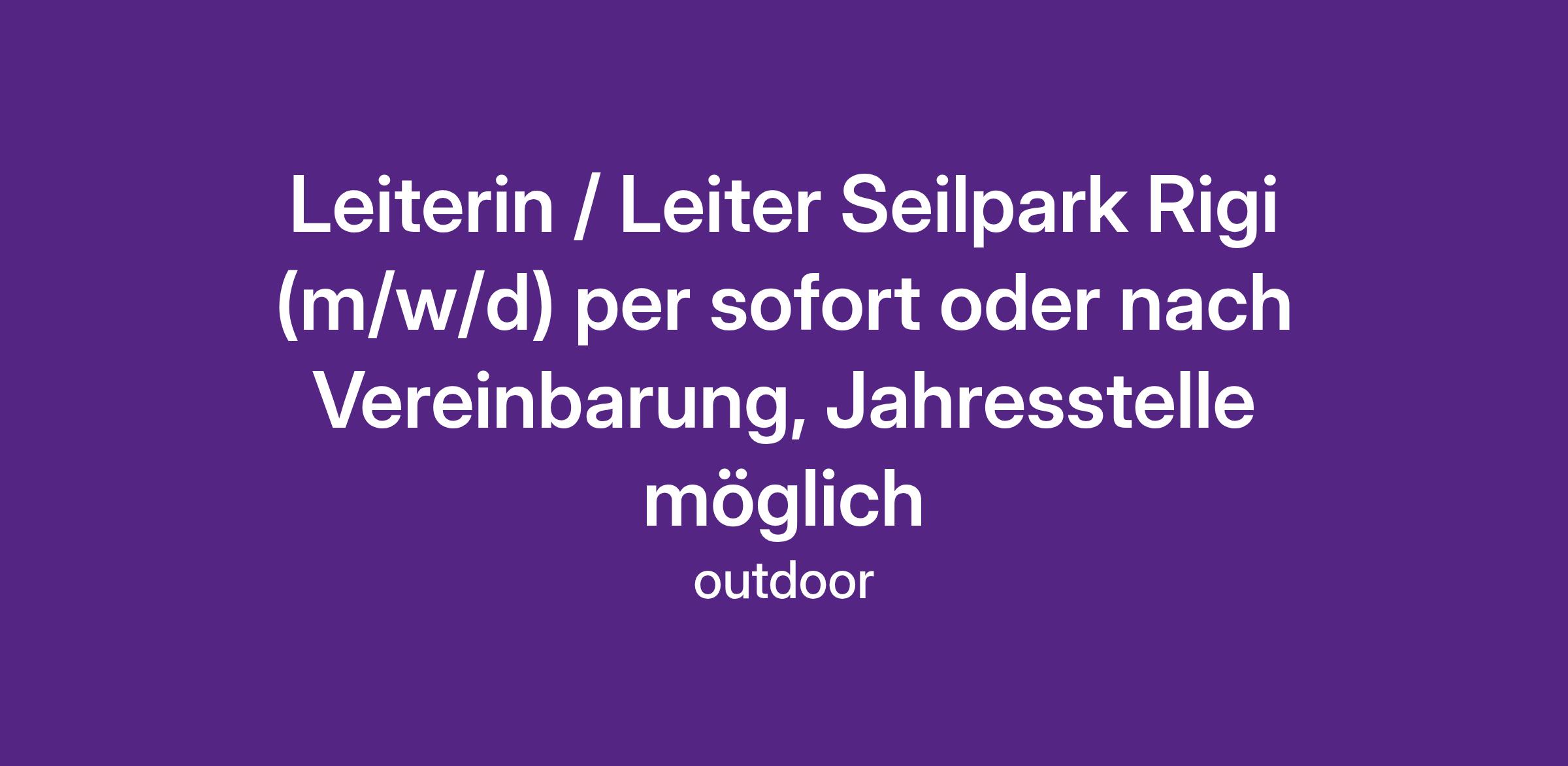 Wenn du ein vielfältiger Teamplayer bist, gerne einen Outdoorbetrieb organisierst und Kletter- Erfahrungen genauso liebst wie wir, dann bist du bei uns genau richtig. Als Leiterin / Leiter Seilpark Rigi oder deren Stellvertretung suchen wir eine Person, die gerne organisiert, aber auch selber mit anpackt. In einer wunderschönen Umgebung gestaltest du mit deinem Team für unsere vielseitigen Gäste unvergessliche Erlebnisse im Seilpark und bist dabei bereit, gelegentlich auch deine Komfortzone zu verlassen.