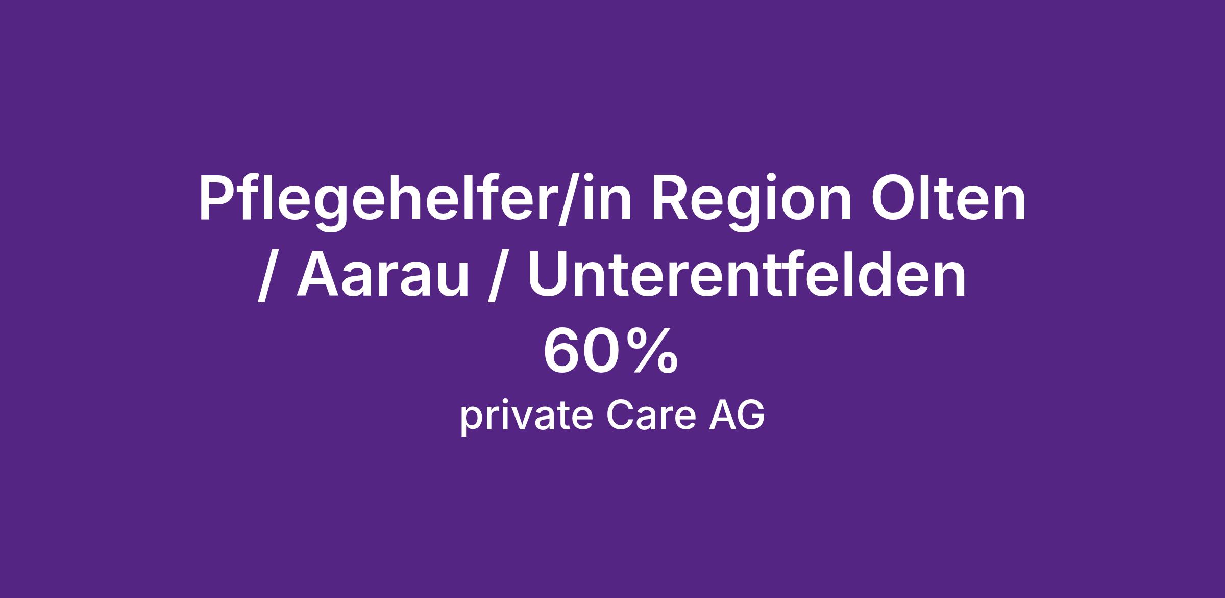 Pflege mit Herz und Verantwortung: Verstärken Sie unser Team im Kanton Aargau als engagierte Pflegehilfskraft (m/w/d) im 60%-Pensum in der Region Olten / Aarau / Unterentfelden – in der Privatpflege, per sofort oder nach Vereinbarung.