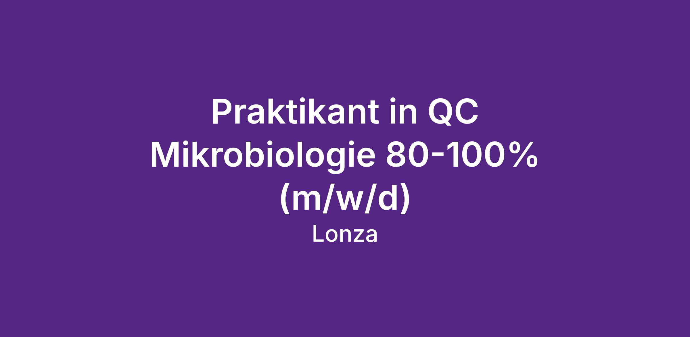 An unserem Standort in Visp, Switzerland suchen wir einen Praktikant (m/w/d) in QC Mikrobiologie. Die QC Mikrobiologie beschäftigt sich mit grossen Bereich von Mikrobiologie-Analysen und ist verantwortlich für die gesamte Mikrobiologie seitens Lonza, in Visp. Wir suchen einen Praktikanten (m/w/d) um unseres Team zu erweitern.