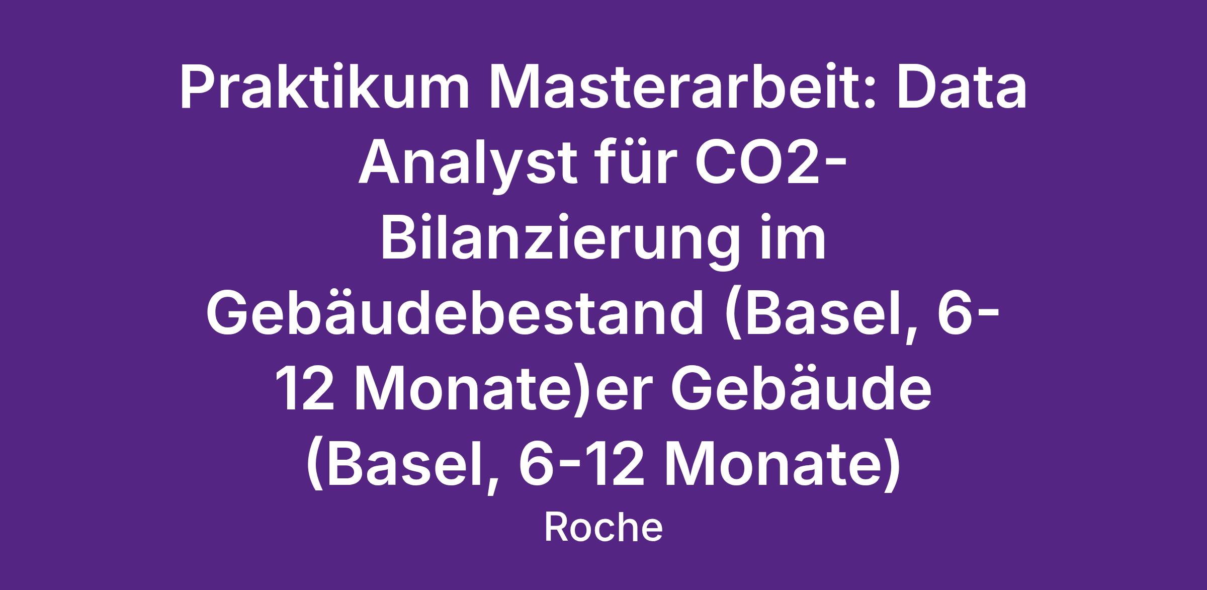 Hast du Lust, einen wesentlichen Beitrag zur CO2-Reduktion bei Roche zu leisten? Wir suchen in der Abteilung „First Net Zero Site“ einen Masterstudenten (m/w/d) für eine Masterarbeit zum Thema „Datenerhebung und Analyse der CO2-Emissionen der Gebäude an den Standorten Basel und Kaiseraugst“.
