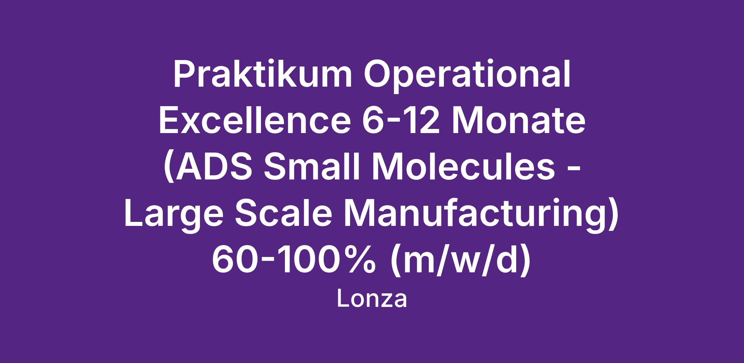 In dieser Praktikumsposition am Standort Visp erhältst du die Möglichkeit, den Alltag der Produktion von Small Molecules innerhalb der Plattform Advanced Synthesis (ADS) im grossen industriellen Massstab kennenzulernen. In einem spannenden und dynamischen Umfeld arbeitest du mit erfahrenen Fachkräften aus verschiedenen Bereichen zusammen und unterstützt die Abteilung Operational Excellence dabei, betriebliche Abläufe kontinuierlich zu analysieren, zu hinterfragen und nachhaltig zu verbessern.