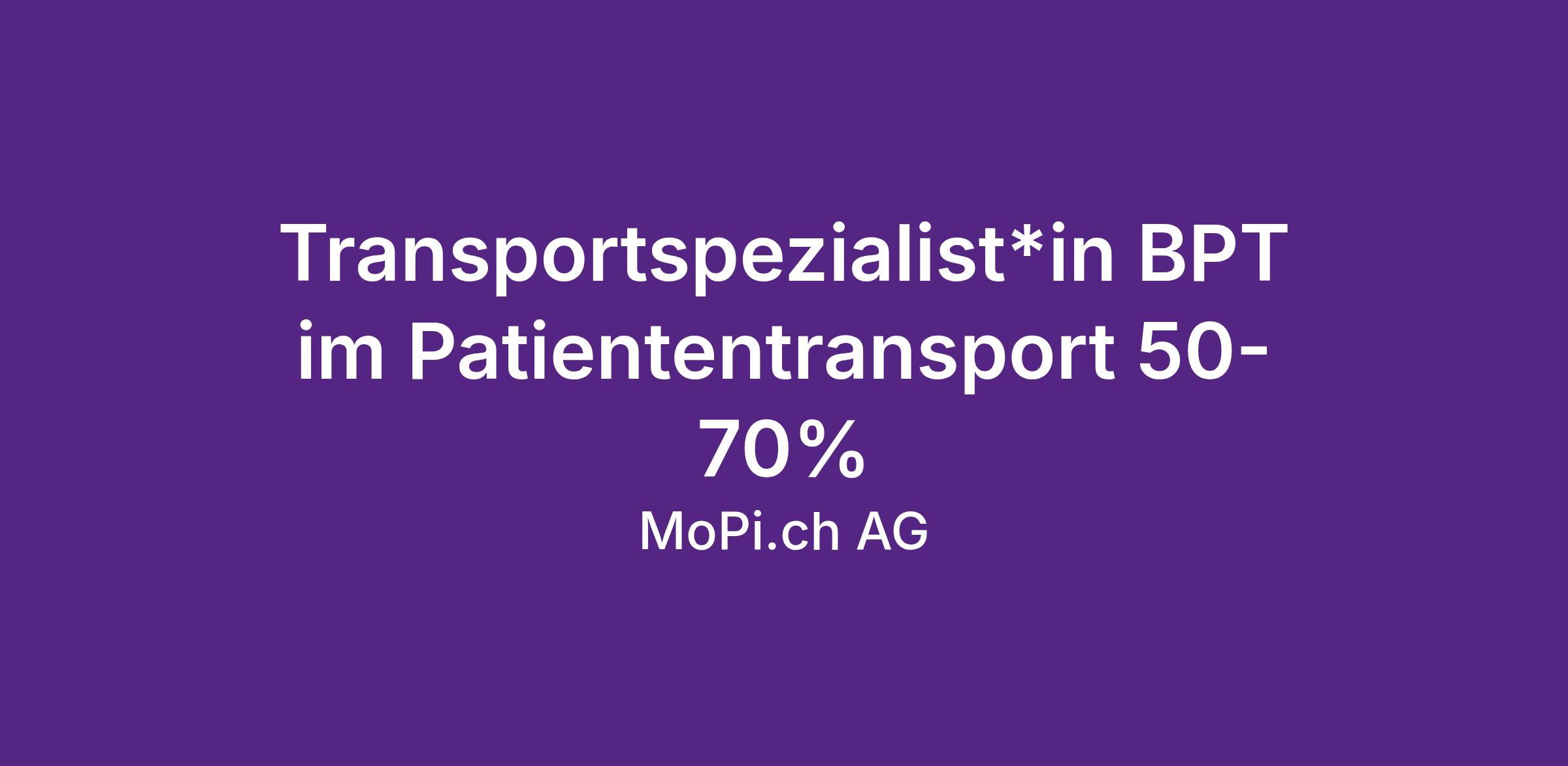 Wir suchen per sofort oder nach Vereinbarung einen engagierten Transportspezialisten BPT, der bereit ist, seine Fahrkompetenz mit einer verantwortungsvollen Aufgabe im Gesundheitswesen zu verbinden. Du verfügst über den Führerausweis der Kategorie B mit der Bewilligung zum berufsmässigen Personentransport (BPT 121)/ (Taxi 122) und möchtest beruflich weiterkommen? Ganz gleich, ob du bereits eine pflegerische Vorbildung mitbringst oder als motivierter Quereinsteiger bei uns durchstarten willst: Bei der MoPi.ch AG – der Schweizer Pionierin im Patiententransport – bieten wir dir die Chance, deine Leidenschaft fürs Fahren in ein professionelles Umfeld einzubringen. Dein Einsatz erfolgt dabei von Montag bis Freitag, jeweils von 08.00 bis ca. 12.00 Uhr.