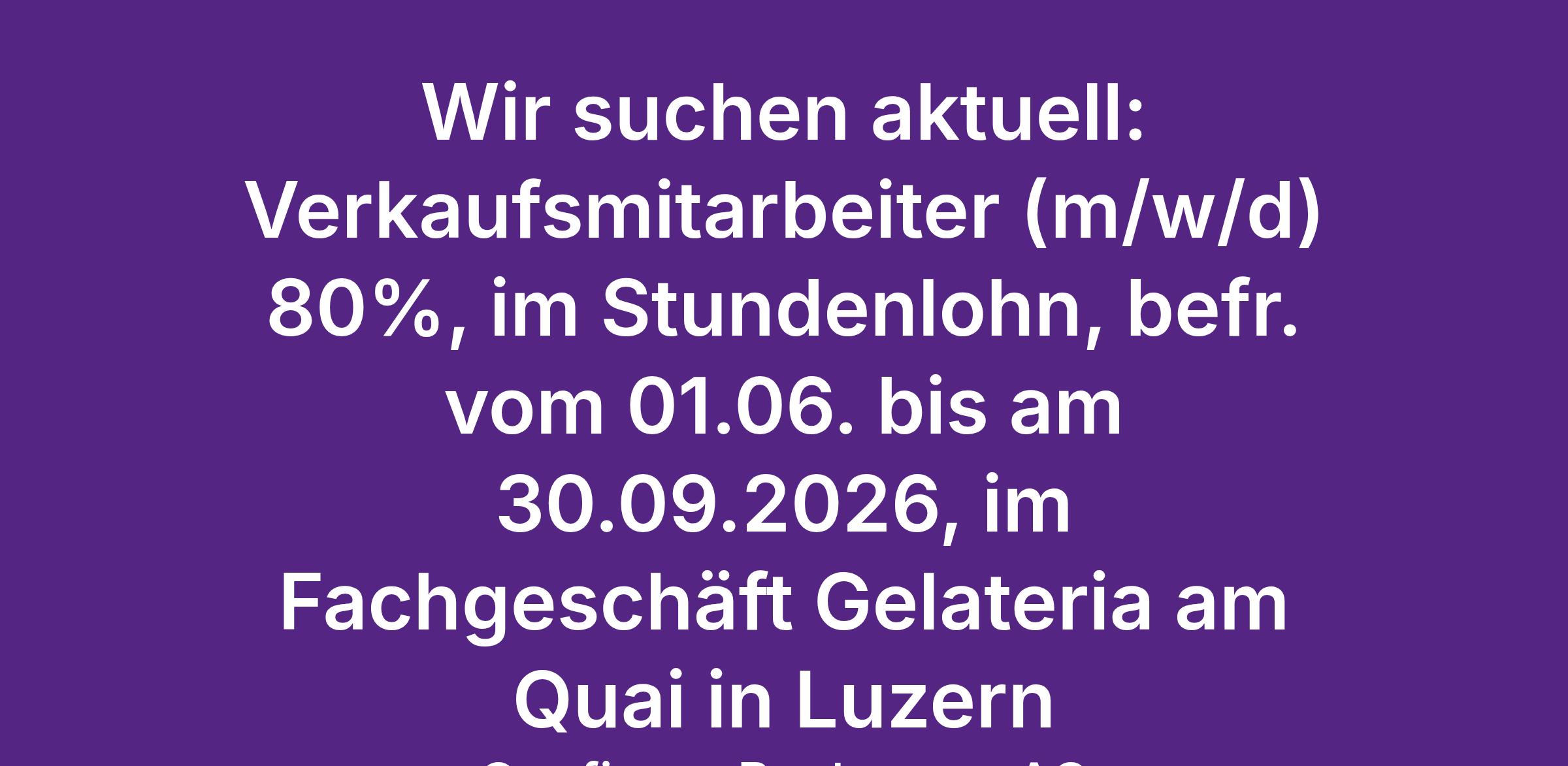 Wir suchen aktuell: Verkaufsmitarbeiter (m/w/d) 80%, im Stundenlohn, befr. vom 01.06. bis am 30.09.2026, im Fachgeschäft Gelateria am Quai in Luzern